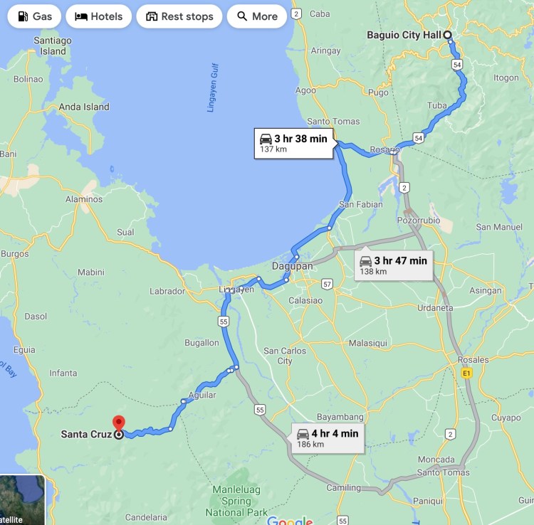 And so Google gave us a shorter route, not the one we knew from memory. It told us to take the turn at Bugallon which we saw would cut across the mountains separating Pangasinan and Zambales. “Great,” we thought! A new route to reduce travel time. We had never heard of this route before and were glad to “discover” it. “Cool!”