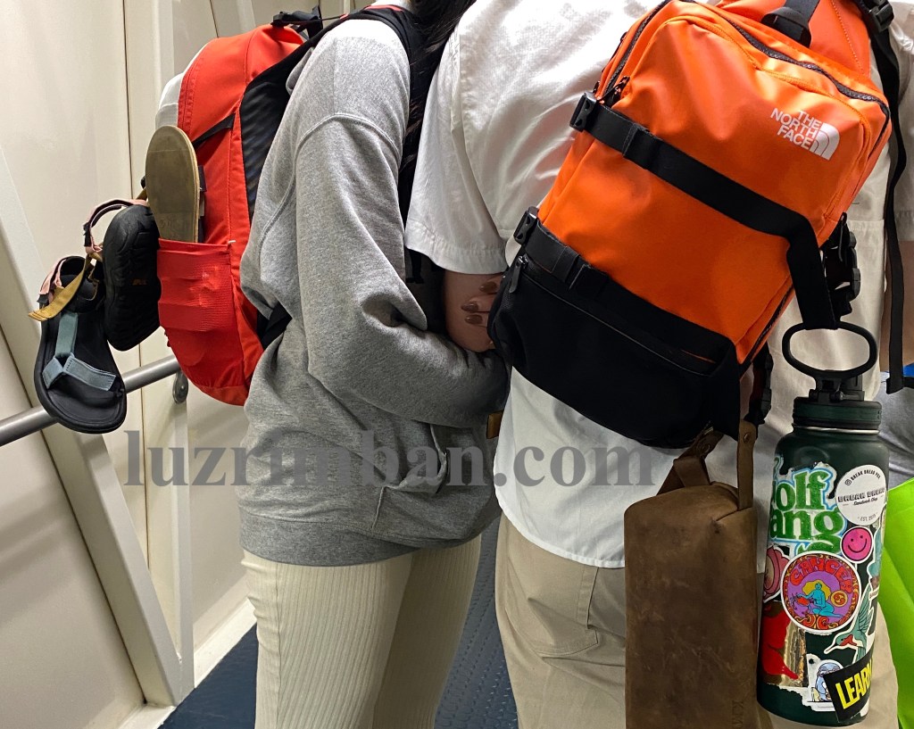 I counted at least three pairs of footwear around the woman’s backpack, two dangling and one in the side pocket. The rubber shoes had traces of dried mud and were stuffed with stuff. A bottle of pills? A gadget? It seemed that every little bit of space was occupied. For his part, the man had a water bottle and a small bag dangling from his pack, but he was also pushing a piece of black luggage.